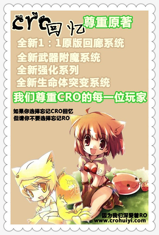 本服是2011年11月1日,盛大服RO倒闭后开始策划,早期由一些官服玩家进行商讨,并以大部分玩家意见搭建的平台,在许多玩家心中最纯净最理想的民间机构,cro回忆这是一个美好ro的回忆!